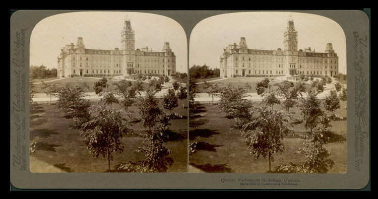 Datée approximativement de 1879, cette carte stéréoscopique est l’une des plus anciennes représentations connues de l’hôtel du Parlement. De 1877 à 1880, les trois ailes de l’édifice actuel du parlement seront construites, soit celle de la Grande Allée, celle de la rue Saint-Eustache (maintenant appelée la rue des Parlementaires) et celle de l’ancienne rue Sainte-Julie. Ces ailes étaient d’abord destinées aux ministères. La construction de cette première phase, qui se chiffre à 392 000 $, se termine en novembre 1880 alors que tous les fonctionnaires s’installent dans le nouvel immeuble. La façade principale, celle donnant sur l’actuelle avenue Honoré-Mecier, sera érigée de 1883 à 1886. Sur la photo, le drapeau au-dessus de la porte centrale indique que le lieutenant-gouverneur Théodore Robitaille occupe déjà l’édifice. Cette photographie est attribuée à Louis-Prudent Vallée, l’un des photographes les plus prolifiques à Québec à la fin du XIXe siècle.