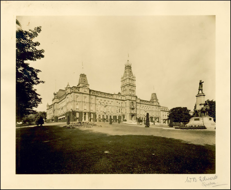 La tour centrale de la façade principale du parlement est complétée en 1886. Du haut de ses huit étages, elle est, à l’époque, la construction la plus haute de Québec. La Grande Allée est alors un chemin de terre et ses trottoirs sont en bois. Cette photographie est l’œuvre du studio Livernois à qui l’on doit d’excellents clichés de la ville de Québec. Fondé par Jules-Isaïe Benoît, dit Livernois, en 1854, ce célèbre studio sera actif jusque dans les années 1970, grâce à trois générations de Livernois.